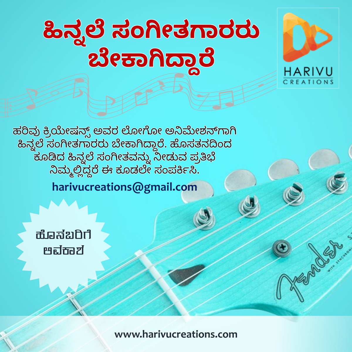 RT @HarivuCreations: ಹೊಸ ಹಿನ್ನಲೆ ಸಂಗೀತಗಾರರಿಗೆ ಅವಕಾಶ… pic.twitter.com/IFRGOnfiRf Posted on June 14, 2018 by @thej RT @HarivuCreations: ಹೊಸ ಹಿನ್ನಲೆ ಸಂಗೀತಗಾರರಿಗೆ ಅವಕಾಶ… pic.twitter.com/IFRGOnfiRf