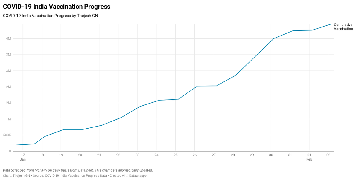 Here is the graph of #covid19 vaccinations in India. #opendata by @datameet pic.twitter.com/rNicgnMjBM